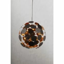With a striking, modern and quirky design, this 6 light black and gold disc pendant will make a great centrepiece in your house. This globe shape light has 6 lights which will shine the light onto the golden discs reflecting the light beautifully giving a nice and soft glow. Bulbs not included. We recommend 6 x E14 candle bulbs.