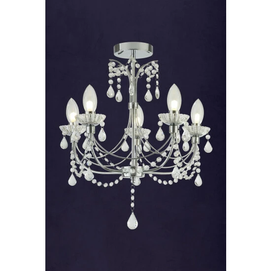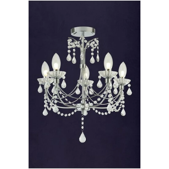 This stunning chandelier has 5 lights with complementing curved arms and crystal sconces, finished with delicate crystal droplets. The five lights brighten any bathroom, bringing instant glamour. Bulbs not included. We recommend 5 x G9 bulbs.