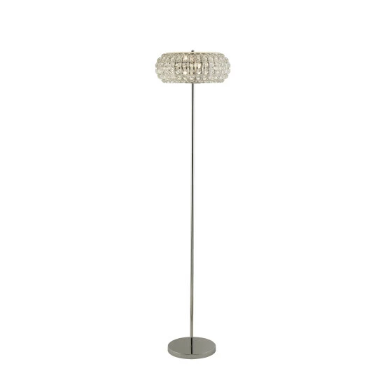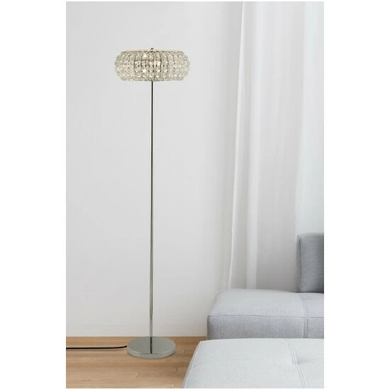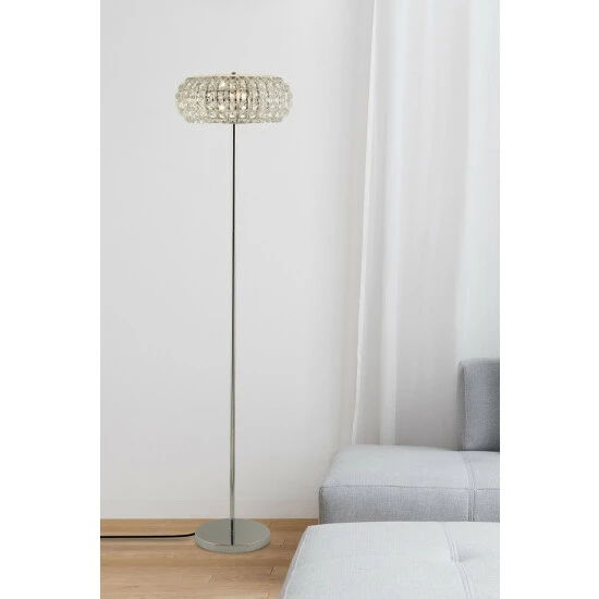 Elegant floor lamp with rounded chrome base and eye catching crystal glass shade in a curved frame design. This will create an impact in both contemporary and more traditional homes. Bulb/s not included. Takes 3 x G9 Halogen bulbs 33W.