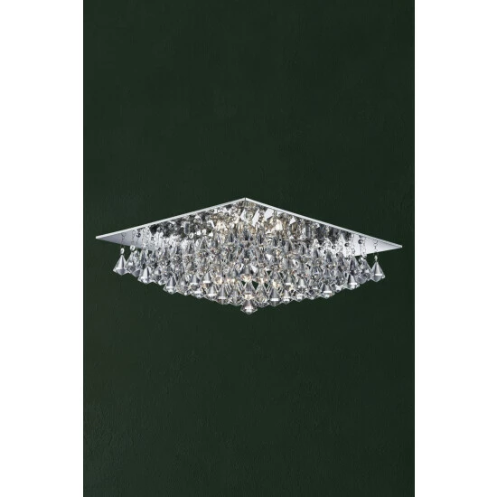 Add a dazzling effect to your room using this striking ceiling light. With 8 lights suspended from a mirrored backplate with crystal drops, this light will add an elegant feel to your home. Bulbs not included. We recommend 8 x G9 bulbs.