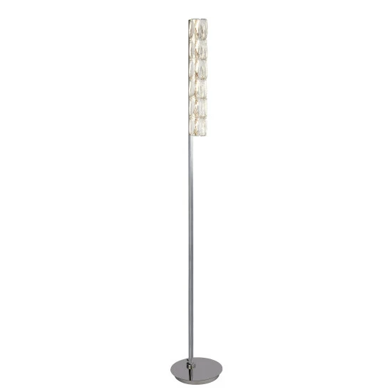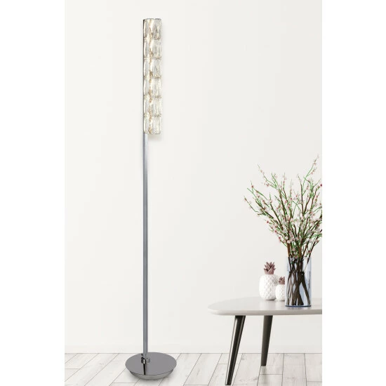 The clear crystal hexagonal tube bar of this floor light casts light around the room creating a stunning visual effect. With a chrome stand and base, and dimmable functionality, this lamp will add elegance to any home. Integrated LED, 16W.