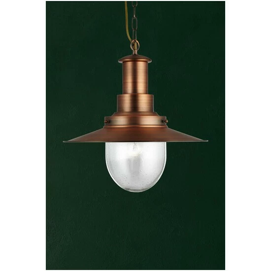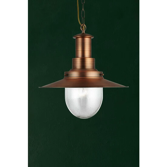 This fisherman’s style metal lantern pendant light is a modern take on a traditional maritime light, finished in on trend copper colour. Complete with an oval seeded glass shade to add a unique character, this light is ideal for lounges, dining rooms, bedrooms, hallways, kitchen and diners. Bulbs not included. We recommend 1 x E27 60W GLS bulb.