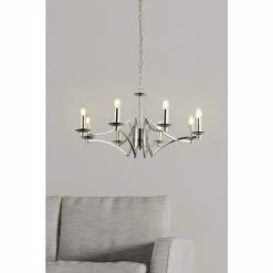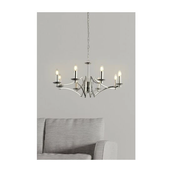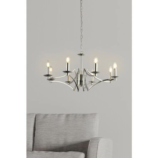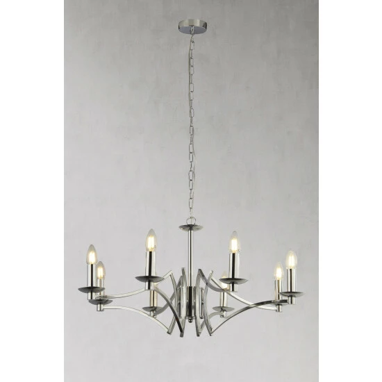 This eye-catching 8 light chandelier is ideal for creating ambience in any bedroom or living room. In an modern chrome finish, and with 8 exposed candle bulbs, this light will be a stunning focal point in any home. Bulbs not included. We recommend 8 x E14 candle bulbs.