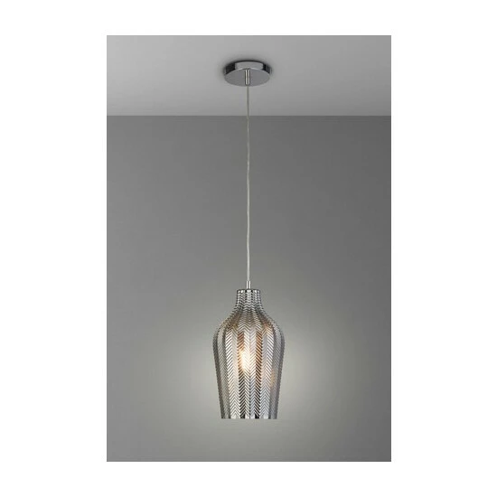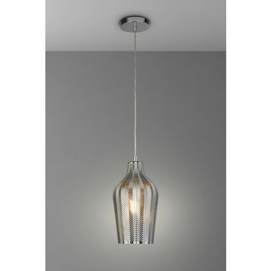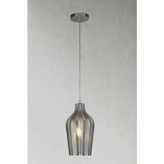 This chrome and smoked ribbed glass ceiling pendant will add simple elegance to any room. The chevron design will create beautiful patterns of light when lit. Bulbs not included. We recommend 1 x E27 40W GLS bulb.
