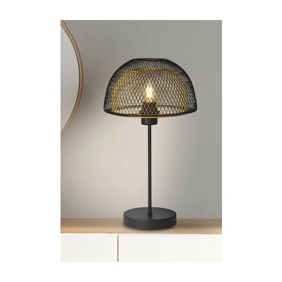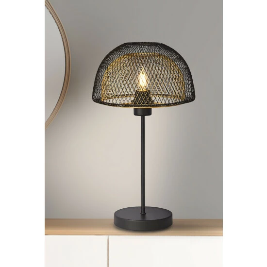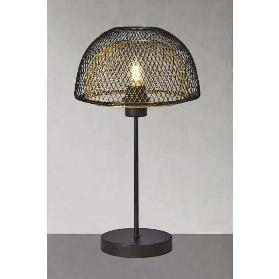 Create a contemporary feel to a living or bedroom with this mesh table lamp. With 2 layers of mesh in black and gold on a black base, this lamp will cast a beautiful patterns around any area it is placed in. Bulbs not included. We recommend 1 x E27 60W GLS bulb.