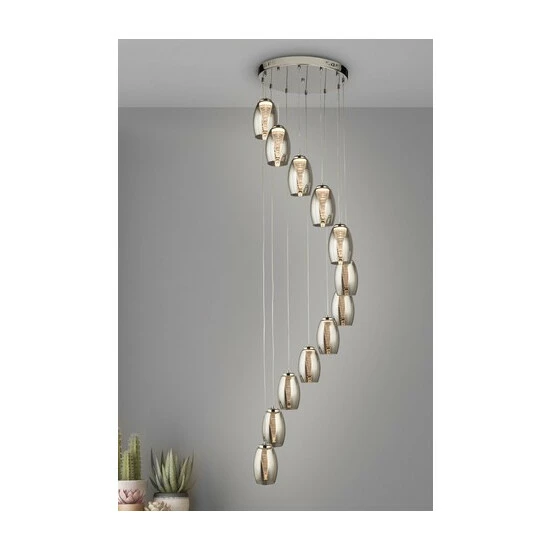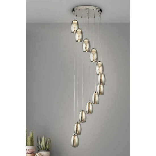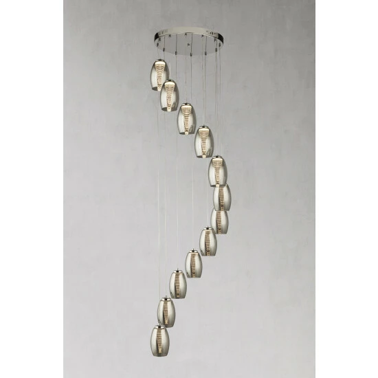Stylish and contemporary this 12 light ceiling light will add the wow factor to any room. This multi drop pendant with smoked glass shade and cone shape inner will add an eye-catching statement to any home. Integrated LED, 63w.