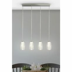 The minimalist style of this 4 light ceiling means that this will suit both contemporary and traditional home decors. The 4 light bar pendant with clear glass shades and cone shaped inner will look beautiful hung low over a dining table or kitchen island, or create a feature in a living room or bedroom. Integrated LED, 22W.