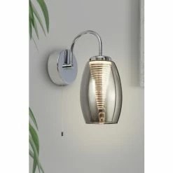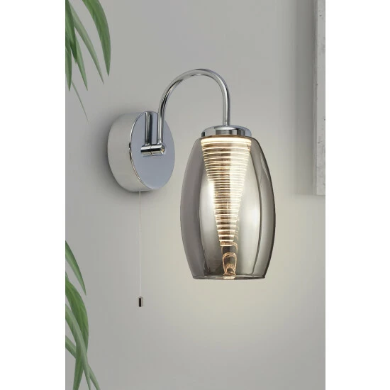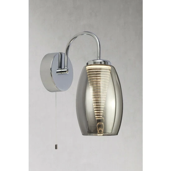 This contemporary wall light will look great in any living or bedroom. The chrome fitting has a smoked glass shade with an eye-catching cone shaped inner, creating a statement for any room in your home. Integrated LED, 6W.