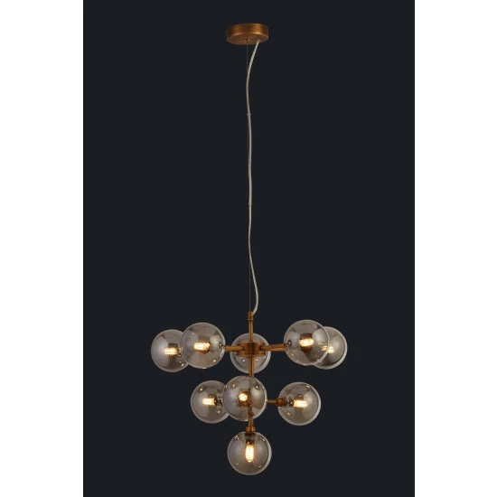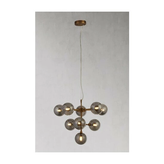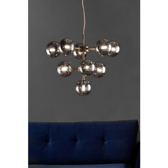 This modern ceiling light will create a stunning focal point in any room. With an antique brass finish and 9 smoked glass ball shades, this light will add a contemporary style to any home. Bulbs not included. We recommend 9 x G9 bulbs.