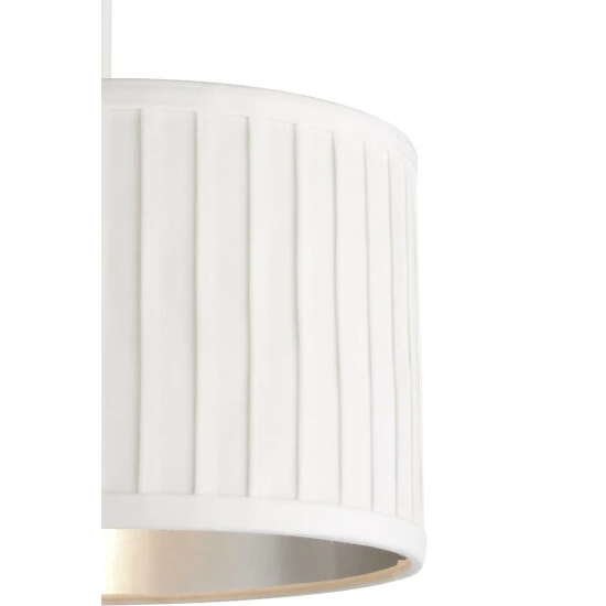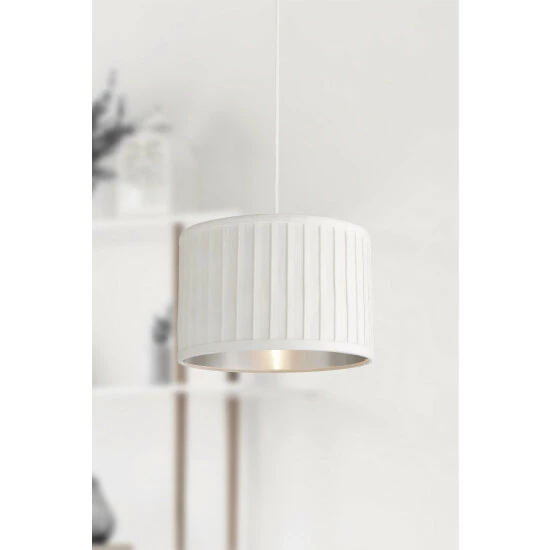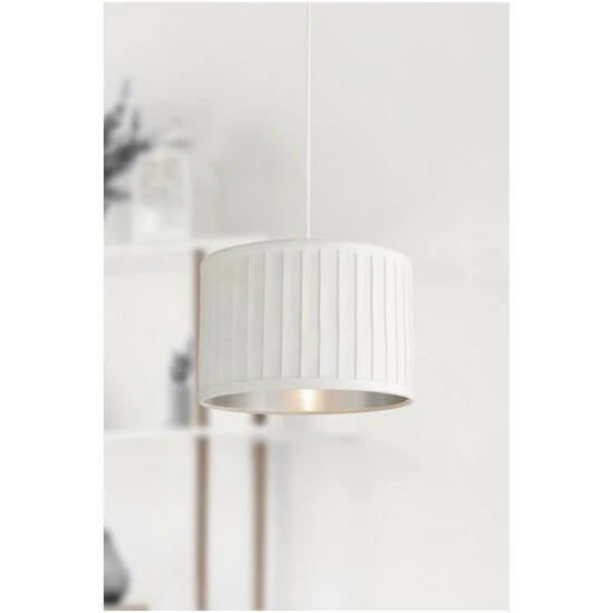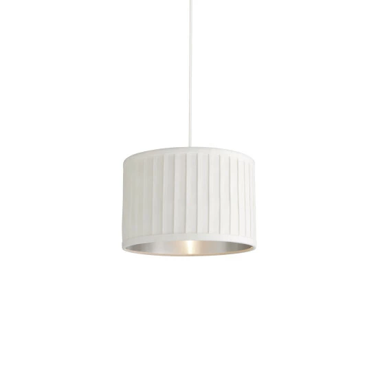 Delicate, vertical pleats provide stylish texture to this drum shaped shade. The silver fabric complements the metallic silver inner to deliver a shade that wouldn’t look out of place in any contemporary living room or bedroom. We recommend E14, E27 or B22 10W bulbs.