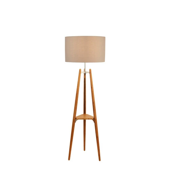 Designed in light wood with complementary pale grey shade, this contemporary floor lamp with single a display shelf detail, combines function and design. Bulbs not included. We recommend 1 x E27 10W GLS bulb.
