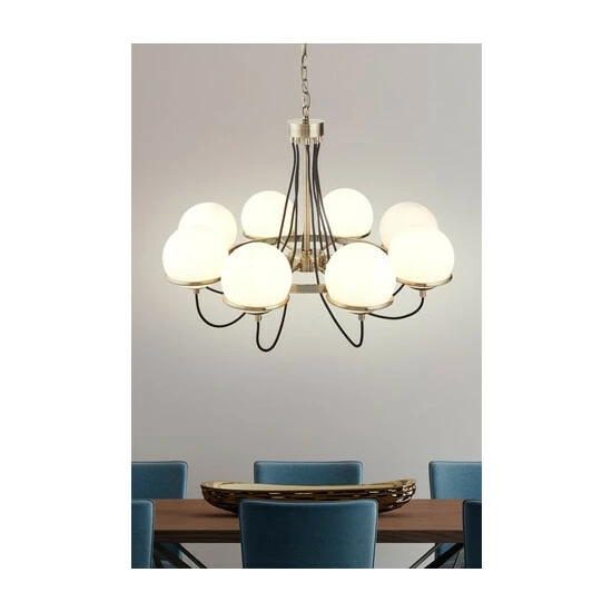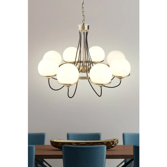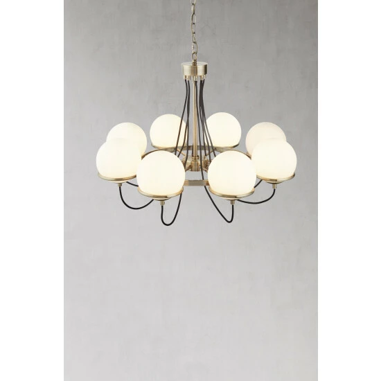 With opal white glass shades and antique brass finish, this ceiling light has a vintage feel to it. The ceiling light is given a modern update as the black braided cable detail covers the body and suspends beneath the lights, meaning that this is suitable for both modern and more traditional homes. Bulbs not included. We recommend 8 x E14 golf ball bulbs.