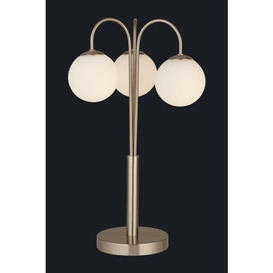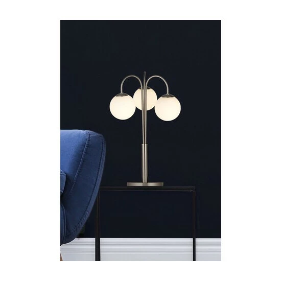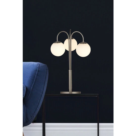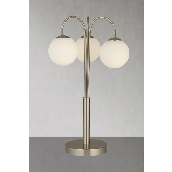 With its retro styling, this 3 light table lamp will add glamour to any home. The 3 white opal balls sit on top of a shiny nickel base which will add a stylish touch to any room. Bulbs not included. We recommend 3 x G9 halogen bulbs.
