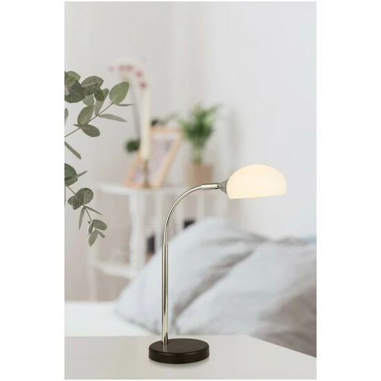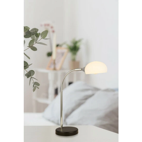 This sleek table lamp is ideal for any living or home office space, with its chrome lamp and white base and white glass shade. Bulb/s not included. Takes 1 x E14 Golf Ball LED bulb 10W.
