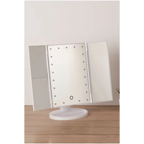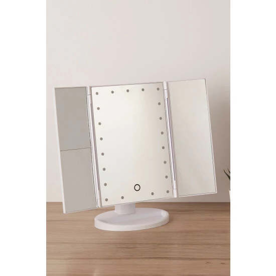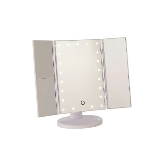 Bring Hollywood glamour to your home with this tri-fold mirror. With 21 lights around the central mirror and a touch sensor for dimming, this mirror is ideal for a dressing table or make up area. Integrated LED. Batteries not included. USB charging cable included.